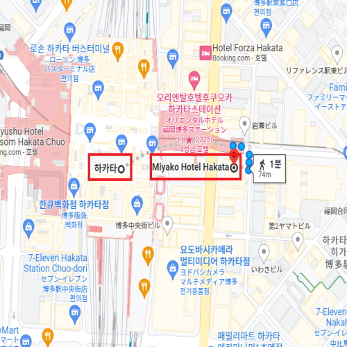 후쿠오카 공항에서 차로 약 15분 소요  하카타 역에서 도보로 약 1분 소요