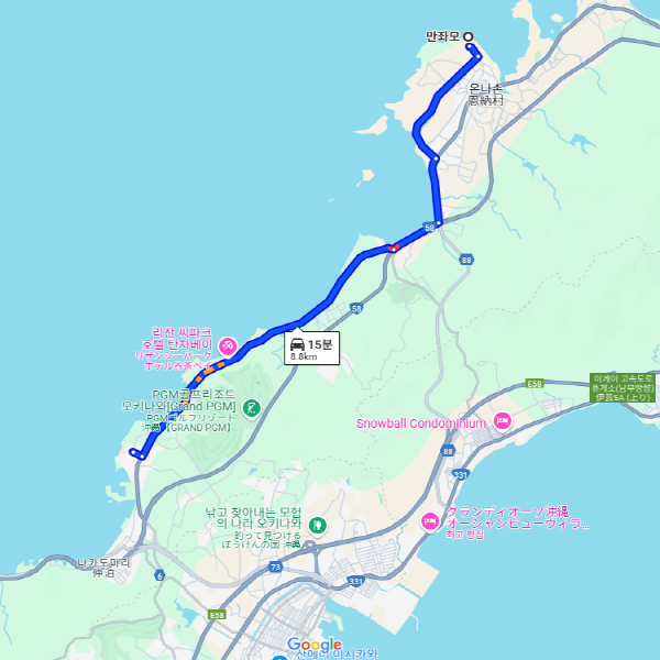 나하 공항에서 차로 약 55분 소요  만좌모에서 차로 약 15분 소요