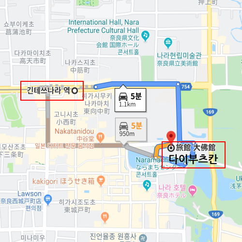 다이쇼 시대에 세워진 다이부츠칸은 나라의 고후쿠지 오층탑의 정면에 위치한 료칸이다. JR 나라역에서 도보 5분거리에 위치해 있으며, 나라공원에서 도보 1분거리에 있는 등 나라 중심지 관광지로의 접근성이 매우 좋은 료칸이다. 나라 공원과 가까워 종종 료칸내에 사슴이 등장하곤 한다. 관내 넓은 대욕장, 구내 무료 주차장, 공용구역에서의 무료 WIFI를 제공하고 있기 때문에 시설 면에서도 좋은 평가를 받고 있다. 전관 일본식 다다미 객실로, 고도(古都) 나라에서의 일본 전통 료칸 숙박을 원한다면 매우 적합하다. 오사카에서 전철 이용 약 34분정도(7정거장)의 거리이기 때문에 오사카 지역으로 여행을 가면서 나라까지 관광을 원하는 여행객에게 추천한다. |