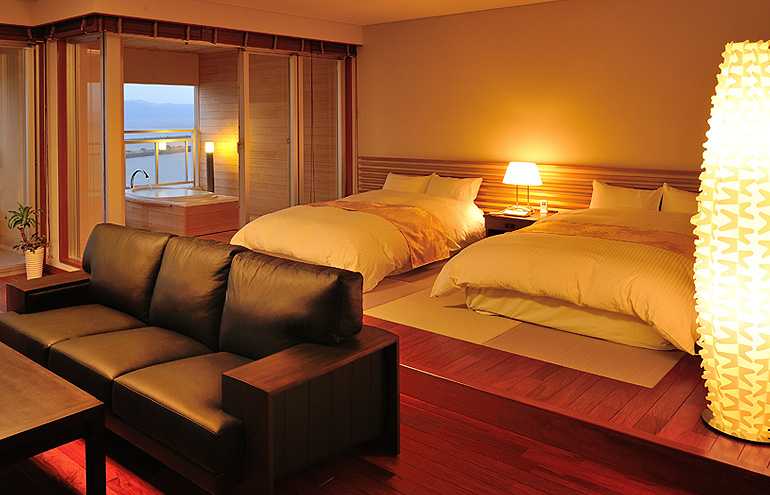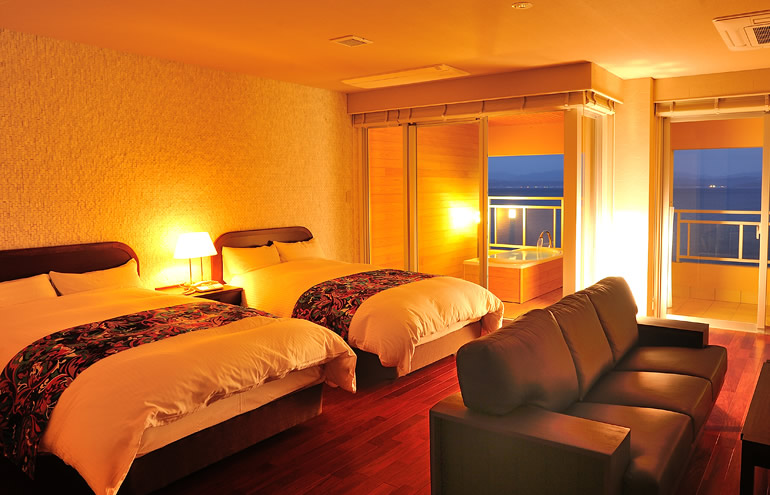 가고시마 반도 남단의 이브스키의 만이 바로 눈 앞에 내려다보이는 리조트 호텔로, 이브스키의 명물인 모래찜질온천과 전세탕, 가이세키 요리가 유명한 곳이다. 리뉴얼된 노천온천 객실은 바다가 보이는 발코니 테라스에 노천탕이 있어 절경을 바라보며 마음껏 입욕을 즐길 수 있다. 일본 전통식 객실을 선호하는 사람들에게는 일반 화실 객실을 추천한다. 갓 잡아 올린 싱싱한 해산물로 이루어진 가이세키는 가고시마 본연의 산해진미의 맛을 느끼기 충분하다. 더불어 여름시즌에는 호텔에 있는 야외풀에서 신나게 수영을 즐길수도 있다. 아열대 나무가 흔들리는 남국 느낌이 충만한 이 곳, 이브스키 시사이드호텔에서 모래찜질, 실외수영장, 노천탕, 가이세키까지 무엇 하나 놓치기 싫은 여행객들에게 추천하는 리조트이다. |