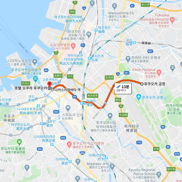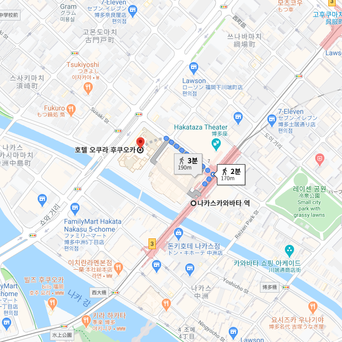-엘레강스한 컨셉의 객실은 하카타의 전통과 서양의 느낌을 융합한 호텔이다. 연극, 미술, 구루메, 쇼핑센타를 겸한 복합 시설 하카타 리버레인에 위치한 호텔 오쿠라 후쿠오카. 도심부에 위치하여 나카스가와바타역과 직결되어 교통이 편리하다. 하카타와도 지하철 2정거장 거리이며, 텐진 시내와도 가까운 위치에 있다. 후쿠오카 공항과도 지하철로 10분, 택시로 20분 거리에 있는 최적의 입지를 자랑한다. |
