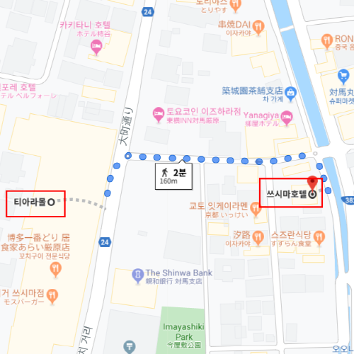 | 시설 주변 정보 | ★ 드럭스토어 마츠모토키요시 이즈하라점 (ドラッグストア マツモトキヨシ 厳原店) : 도보 약 5분 소요. - 영업시간 : 08:30~23:00 - 전화번호 : 0920-53-5225 ★ 슈퍼마켓 쓰시마 마루에이 (対馬丸栄) : 도보 약 1분 소요. - 영업시간 : 08:30~19:00 - 전화번호 : 0920-52-3131 ★ 편의점 패밀리마트 (ファミリーマート対馬厳原大手橋店) : 도보 약 1분 소요. - 영업시간 : 24시간 - 전화번호 : 0920-52-6644 |