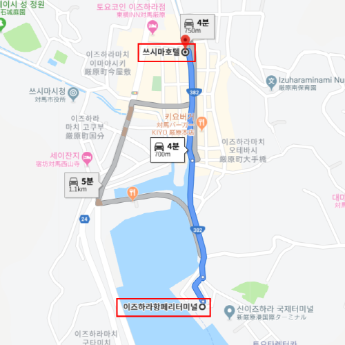 공항 기준이즈하라항구에서 차로 약 4분 소요 (도보 약 9분소요) |