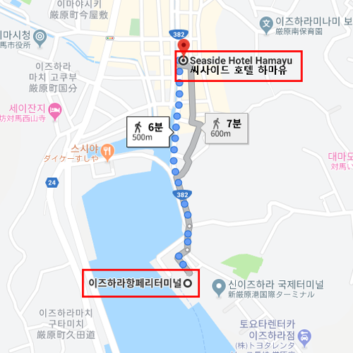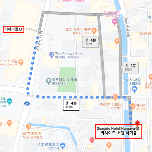 씨사이드호텔 하마유는 이즈하라 마을 안에 있어 마을의 편의시설, 식당, 마트, 관광지와도 접근성이 좋은 호텔이다. 유명 관광지로는 조선 통신사기념비, 쓰시마 역사민속자료관, 덕혜옹주 결혼봉축기념비 등이 도보로 10분 거리에 있어 대마도 이즈하라 마을 관광에 적합한 호텔이다. 객실에서는 이즈하라 마을의 전경과 호텔 앞 작은 강이 보여 마을의 운치 있는 모습을 객실에서부터 볼 수 있다. 호텔 왼편으로는 숙박객들을 위한 무료 주차장도 운영되고 있다. 정성을 담은 친절한 접객으로 창업 후 30년간 호텔을 운영했으며, 그동안 많은 한국 고객들이 찾아 준 호텔이다. 호텔 안내 표지를 한글로 적어 한국인 숙박객의 이용에 불편함을 최소화하기 위해 노력하고 있는 호텔이다. |