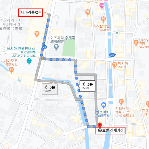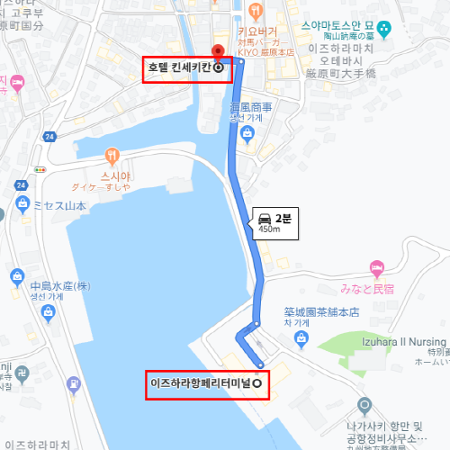 호텔 킨세키칸은 대마도 공항에서 자동차로 약 23분 소요로 도착할 수 있는 호텔이다. 그뿐만 아니라 이즈하라항 (厳原港) 에서도 도보로 6분 정도 이동하면 도착할 수 있다. 호텔 근처로는 라면 전문점부터 햄버거 가게, 이자카야, 우동, 야키니쿠 전문식당 등이 있어 다양한 음식점을 취향에 맞게 이용할 수 있다. 근처 유명관광지로는 덕혜옹주 결혼 봉축기념비, 대마도 역사 민속자료관, 가네이시 성터 등이 있다. 싱글 객실이 메인인 호텔로 한적한 분위기에서 숙박을 원하는 고객들에게 추천하는 호텔이다. 객실에서는 이즈하라 (厳原)마을 전경을 볼 수 있어 해 질 녘 마을의 노을을 보며 쉴 수 있는 호텔이다. |