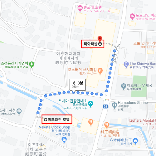2014년 8월에 오픈한 호텔 미쓰와칸은 이즈하라 (厳原) 시내에 자리 잡고 있다. 돌담으로 둘러싸여 있고 1인 숙박만 가능한 아담한 호텔이다. 대마도 관광지로 유명한 일본 삼대 묘지의 하나인 만송원(万松院) 이 도보로 약 3분 거리이다. 그 외 각종 편의시설로는 대마도 관광 정보관이 도보로 약 1분, 유명 쇼핑몰 티아라 몰은 도보로 약 2분 거리에 있다. 호텔에서 파스타 전문점도 함께 운영하고 있다. 피자나 파스타를 맛보고 싶은 고객들이라면 다른 음식점을 찾기 위해 이동할 필요 없이, 호텔 “비스트로 파스타” 식사 처에서 바로 맛볼 수 있다. |