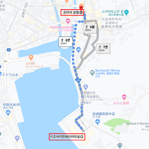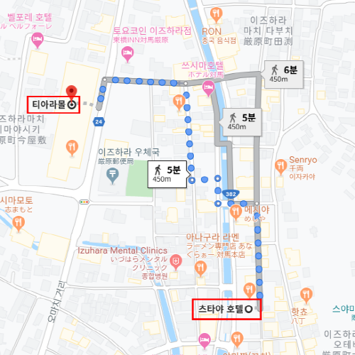 츠타야 호텔은 이즈하라항에서 도보로 약 6분 거리로 접근성이 좋은 호텔이다. 호텔 근처로는 햄버거 가게, 일본식 선술집 (이자카야), 라면 전문식당, 일식 레스토랑 등 식당들이 밀집하고 있어 취향에 맞게 식당을 찾아 이용할 수 있는 호텔이다. 앤티크한 분위기의 로비에는 자판기 코너도 만들어져 있다. 츠타야 호텔 앞으로는 개천이 흐르고 있어 객실에서부터 마을과 개천 전망을 함께 볼 수 있다. 호텔 식사처에는 메뉴와 주의사항이 한글로 적혀있어 한국인 숙박객들의 편의를 돕고 있다. 마을의 대표 쇼핑 몰인 티아라 몰도 도보로 약 5분 거리이다. 유명 관광지인 조선 통신사 기념비, 덕혜옹주 결혼 봉축 기념비, 가네이시 성터 등도 도보로 약 10분 소요로 이동할 수 있다. |