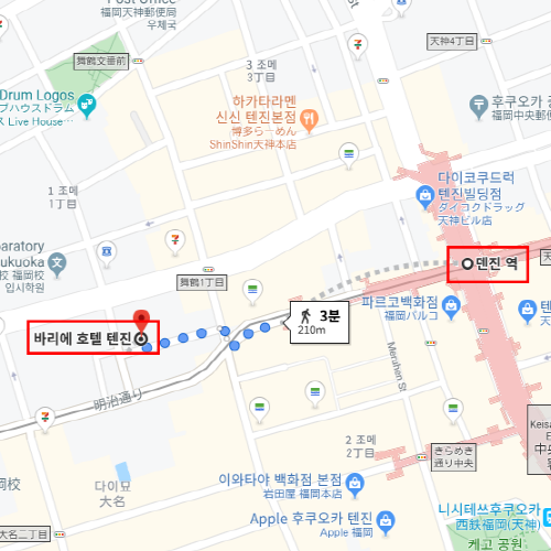후쿠오카의 번화가 텐진에 위치한 바리에 호텔 텐진은 버스터미널과 지하철역 근처에 위치해 교통편이 매우 편리한 호텔이다. 2015년 6월엔 전 객실이, 2016년 2월에는 조식 뷔페가 재단장 오픈하여, 더 깔끔하고 청결한 시설로 숙박객들을 맞이하고 있다. 객실의 타입뿐만 아니라 디자인도 4종류가 준비되어 있어 각각 다른 객실의 분위기를 즐길 수 있다. 번화가 한가운데 있어 텐진 주변 관광지를 이용하기도 쉬워, 관광을 즐긴 후 호텔에 들어가 몸을 쉬게 하기 좋은 호텔로 관광객들에게 인기 있는 호텔이다. |