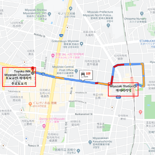 - 일본에서 저렴한 가격대와 깨끗한 객실로 유명한 비지니스 호텔 토요코인 미야자키 추오도오리는 JR 미야자키(宮崎駅)역에서 도보 10분의 입지에 위치해 있어 출장으로 이용하는 사람 뿐만 아니라 관광객들에게도 인기가 있는 비지니스호텔이다. 시내 및 관광지와 접근성이 좋아, 여행 경비에서 숙소의 가격보다는 관광에 비중을 두는 관광객이라면 합리적인 가격에 숙박할 수 있다. 특히 조식을 무료로 제공하고 있어 주먹밥과 된장국, 빵 등으로 간단하게 식사를 하고 여행을 시작할 수 있다. 로비에서 컴퓨터 및 프린터를 사용할 수 있고 코인 자동 세탁기가 있어 여행 중 간단한 빨래도 가능하다. 또한, 다리미 무료 대여도 가능하기 때문에 빨래 후 다리미를 이용할 수 있다. 주변 관광지로는 미야자키 과학기술관, 현립미술관, 미야자키 신궁 등은 도보 20분, 자동차 10분 이내의 거리에 위치해 있으며 아오시마섬은 자동차로 약 30분 거리로 많은 관광객이 찾는 추천 관광지이다. |