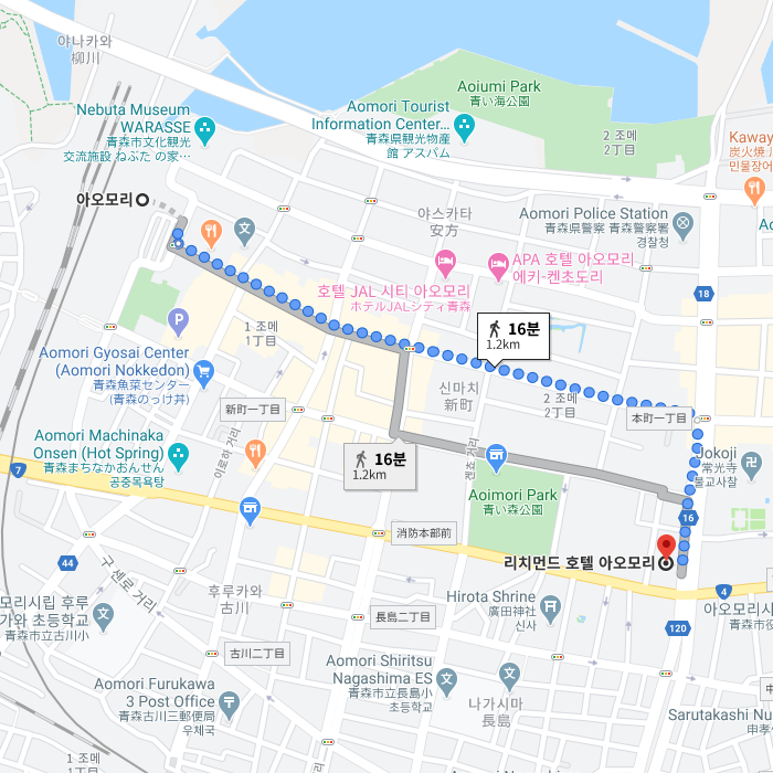 -리치몬드 호텔 아오모리는 JR아오모리역(青森駅)에서 도보로 약 15분 소요되는 곳에 있어 체크인 전, 체크아웃 후에 짐을 맡기고 주변 관광을 할수 있는 지리적 강점이 있는 호텔이다. 총 객실 수 175실로 다양한 타입의 객실을 보유하고 있으며, 모던한 디자인과 청결함을 강조하는 호텔이다. 객실 내 침대는 미국 호텔 점유율 1위를 자랑하는 프랑스 침대 회사의 포켓 코일 매트리스를 사용하고 있어, 넓은 면적과 안락함을 느낄 수 있다. (헐리우드 트윈 제외) 전 객실 내에 공기 청정기가 (가습기 기능 포함) 설치되어 있으며, 밝은 조명과 넓은 테이블, 무료 와이파이 및 유선 LAN, 노트북 대여 서비스가 있어 비지니스 및 관광에 최적의 조건을 갖추고 있다. 주변 관광지로는 아오모리 A팩토리, 아스팜, 아오모리 시민 전시관, 아오모리현립 향토관 등 자동차로 약 15분 이내로 이동 가능한 추천 관광지이다. |