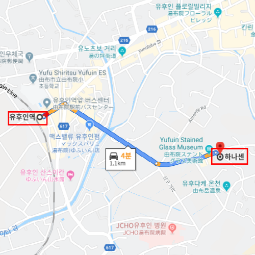 숙박지 주변유후인역까지 차로 약 4분 소요 (도보 약 14분) |