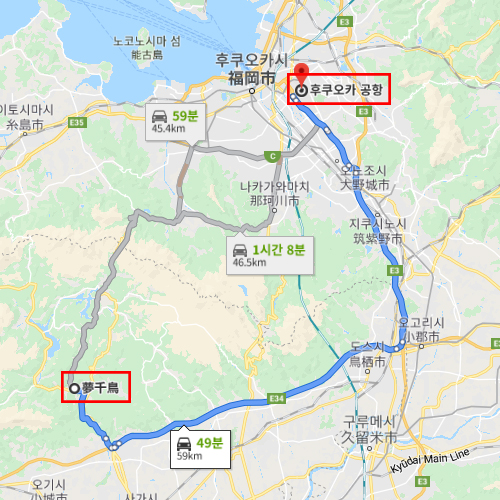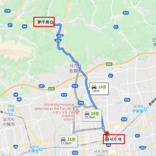 | [교통 안내] - 사가역 버스센터에서 쇼와버스(昭和バス) 후루유 온천 방면 승차 → 쿠마노가와 온천(熊の川温泉) 하차 (약 40분 소요) → 하차 후 도보 3분 이내 * 버스의 배차 수가 1시간에 1대 정도로 적은 편입니다. |