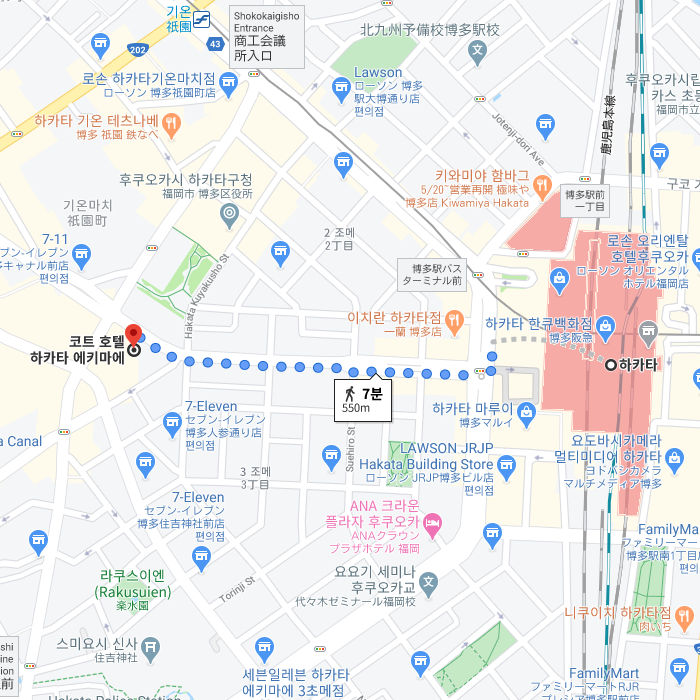 -JR 하카타 역에서 도보 7분 거리에 있는 「코트호텔 하카타에키마에」는 대형 상업시설인 캐널시티 하카타를 바로 근처에 두고 있으며 도보 10여 분 정도로 나카스, 텐진까지 활보할 수 있는 위치에 있어 하카타 시내를 둘러보기 좋은 장소에 자리하고 있다. 비즈니스호텔답게 숙박의 기본에 충실한 객실은 컴팩트한 공간을 잘 활용하였다. 또한, 영국의 유명 매트리스 브랜드인 "Slumberland"의 제품을 사용하고 있어 편안한 잠자리를 제공하고자 하는 호텔의 배려를 느낄 수 있다. 조식은 1층의 카페에서 이용할 수 있으며 4종의 양식 세트 메뉴 중 선택이 가능하다. 편리한 이동과 바쁜 일정 뒤의 적절한 휴식을 원하는 자유여행객에게 추천하기 좋은 곳이다. |