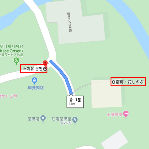 | 기타 | ◎ 스지유 온천마을의 공동욕장 소개! - 우타세유(うたせ湯) : 일본 제일의 우타세유 체험이 가능 / 이용료 300엔 06:00~21:30 - 야쿠시유(薬師湯) : 히노키 욕조의 실내탕, 이완유와 매일 남, 여탕 교대로 운영 / 이용료 300엔 07:00~22:00 - 이완유(岩ん湯) : 석조 노천탕, 야쿠시유와 매일 남, 여탕 교대로 운영 / 이용료 300엔 07:00~22:00 - 이코이노히로바(いこいの広場) : 무료 이용 가능한 족욕탕 / 07:00~22:00 ※ 우타세유(うたせ湯)란? 온천수가 높은 곳에서 떨어지도록 만든 폭포탕으로 온천수 맛사지 효과를 즐길 수 있다. |