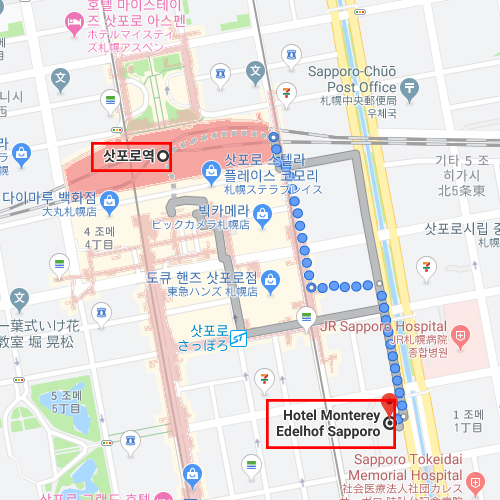 호텔 몬트레이 에델호프 삿포로는 JR 삿포로역 도보 7분 거리에 위치한 호텔이다. 에델호프는 독일어로 "귀족의 저택"을 의미하는데, 호텔 몬트레이 에델호프 삿포로는 단어 의미를 살려 고객들이 귀족의 저택이라는 생각이 들 수 있도록 서비스를 제공한다. 객실은 차분한 분위기지만 마호가니 가구의 배치로 세련된 멋스러움도 느낄 수 있다. 지상에서 60m 이상 떨어진 22층의 고층 건물로 낮에는 삿포로 시내, 밤에는 반짝이는 야경을 감상 할 수 있다. 조식은 홋카이도 식재료를 사용한 뷔페식으로 맛볼 수 있다. 호텔 내에 천연온천을 기반으로 한 스파시설이 준비되어 있다. 천연 온천뿐만 아니라 암반욕, 사우나도 즐길 수 있다. 바쁜 여행으로 보낸 시간은 잠시 잊고, 몸과 마음을 치유 할 수 있다. 또한 14층에 위치한 온천시설에서 온천욕을 즐기면서 삿포로의 전경 혹은 야경을 감상 할 수 있는 큰 장점이 있다. 편리한 교통위치로 관광은 물론 삿포로의 야경도 감상 할 수 있는 두 마리의 토끼를 잡을 수 있는 호텔이다. |