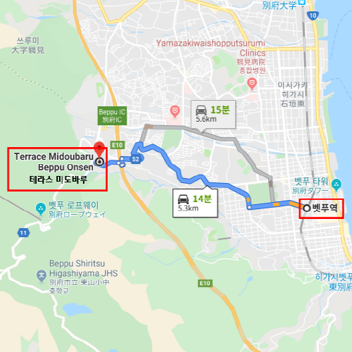 숙박지 주변벳부역에서 차로 약 14분 소요 |