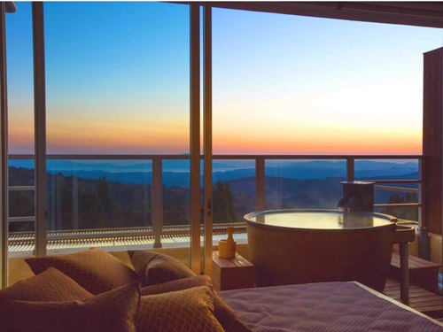 기리시마의 밤하늘에 떠 있는 신비로운 은하수를 모티브로 연출한 아마테라스. 로맨틱한 분위기의 연출과 오모테나시 (정성을 다하여 손님을 모신다는 의미)가 매력적인 곳이다. 호텔의 시설명에는 견우와 직녀, 은하수의 이름을 넣었으며, 25개의 모든 객실은 별자리의 이름으로 되어있다. 모든 객실은 산 측을 향해 있어, 가고시마의 상징인 기리시마산, 사쿠라지마 등의 아름다운 절경을 볼 수 있다. 화양실, 양실을 비롯하여 노천온천이 포함되어 있는 객실이 있으며, 성인만 숙박이 가능하므로 조용한 시간을 보낼 수 있다. 온천은 모두 카케나가시(온천수를 흘려보내는) 방식의 천연온천이며, 가족탕의 넓은 온천 풀에서는 가고시마의 아름다운 풍경을 만끽하며 온천욕을 즐길 수 있다. 요리는 석식은 가이세키, 조식은 양식으로 준비되며, 전속 파티시에의 오리지널 스위츠도 맛볼 수 있다. 일본 최초의 신혼여행의 발상지 기리시마에서 부부, 연인, 친구 그리고 소중한 사람과 함께 아름다운 추억을 만들고 싶은 분들에게 추천하는 곳이다. |