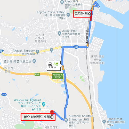 숙박지 주변고지마역에서 차로 약 8분 소요 |