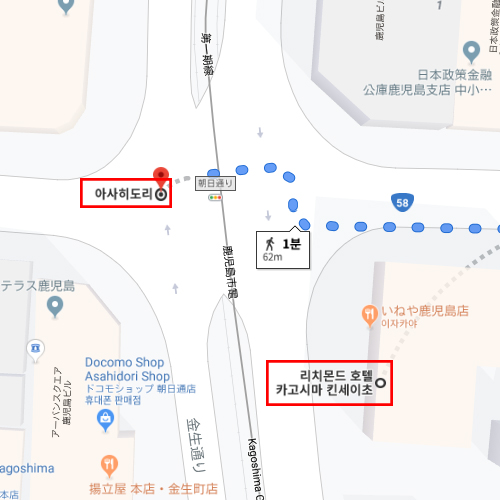 | [교통안내] JR 가고시마 중앙역(鹿児島中央駅)에서 노면전차 이용 [아사히도오리(朝日通り駅)] 정류장 하차 후 바로 도착 |