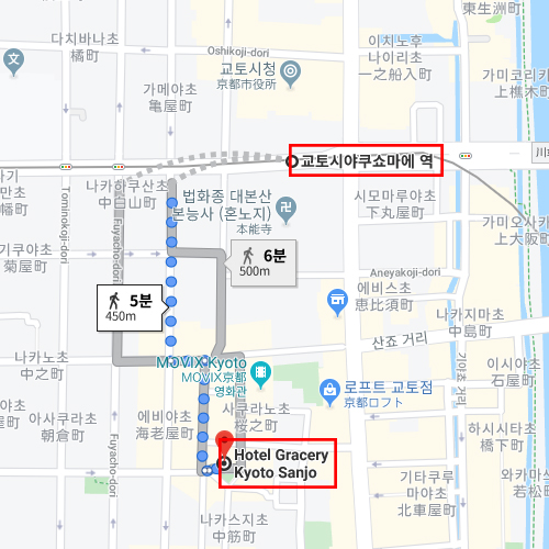 교토의 중심 가와라마치역에 위치한 호텔이다. 객실은 북관 남관으로 나누어져있으며 북관은 더블룸, 남관은 트윈룸으로 되어있다. 가부키룸은 교토의 분위기를 느낄 수 있도록 디자인되어있다. 이 호텔의 매력은 요리인데 식자재를 최대한 살린 독자적인 메뉴로 구성되어있다. 여성이나 처음 일본을 방문하시는 분들도 즐길 수 있다. |