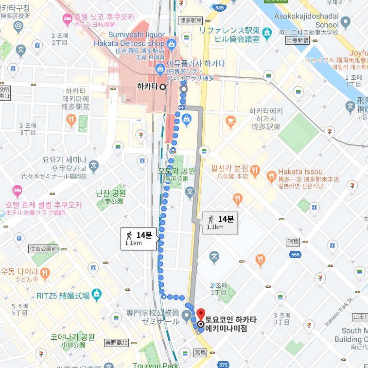 토요코인 그룹에 속한 하카타에키미나미호텔은 후쿠오카 번화가의 중심인 하카타역에서 도보로 약 15분 정도 떨어진 곳에 위치한다. 이동 시간만 보면 가깝지 않게 느껴질 수도 있으나 호텔중에선 드물게 역에서부터 무료 송영 서비스를 운영하여, 역에서부터 호텔까지 편리하게 이동할 수 있는 장점이 있다. 많은 관광객들에게 알려진 요도바시카메라와 하카타역 건물등 유명 관광지들까지 도보로 이동이 가능하여, 관광에도 용이한 위치에 있다. 이러한 접근성에 반해 가격이 매우 저렴해 여행객 또는 출장으로 후쿠오카를 방문한 숙박객에게 호평을 받고 있다. 싱글 객실이 많이 갖춰져 있어 1인 여행에도 적합한 호텔이며, 하카타 시내 관광을 만끽하고 싶은 커플이나 친구끼리의 여행에도 적극 추천하는 호텔이다. |