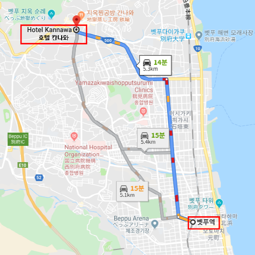 숙박지 주변벳부역에서 차로 약 14분 소요 |
