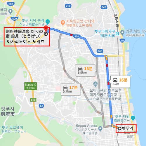 숙박지 주변벳부역에서 차로 약 16분 소요 |