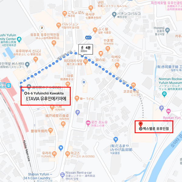 ETAVIA 유후인에키마에는 2019년 2월에 오픈한 온천 호텔로, 유후인 역에서 도보 1분 거리에 위치하여 유후인 관광에 최적화된 온천 호텔이다. 총 7실로 전 객실 금연이며, 모든 객실에 더블 침대로 되어 있어 2인 이용 시에는 넓게 이용 할 수 있고, 1객실에 최대 6명까지 숙박할 수 있기 때문에 그룹 여행에도 탁월한 호텔이다. 객실 내 노천온천이 포함된 객실을 보유하고 있으며, 일반 객실에 숙박하여도 옥상에 있는 전망 노천 온천을 24시간 자유롭게 이용할 수 있다. 식사는 제공하지 않지만 객실 내에 전자레인지가 있어 음식을 반입하여 식사할 수 있다. 유후인에서 리즈너블한 가격으로 객실 내 노천을 찾는 분들께 추천한다. |