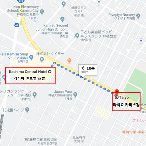 숙박지 주변슈퍼마켓 타이요 카미스점까지 도보 약 10분 소요 |