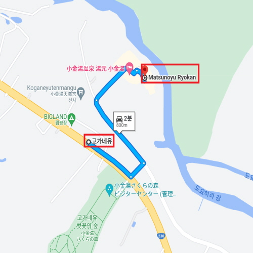 신치토세 공항에서 차로 약 1시간 7분 거리에 위치한 마츠노유 료칸은 코가네유온센 버스정류장(小金湯温泉バス停)에서 송영이 가능하여 편리함을 제공하고 있다. 또한 료칸에 마련된 노천탕에서는 대자연의 풍경 속에서 피부에 좋은 코가네유온천(小金湯温泉)을 마음껏 즐길 수 있으며 홋카이도의 식재료를 활용한 맛있는 요리를 맛보며 가족 또는 연인과 힐링하며 쉬어가기 좋은 료칸이다. |
