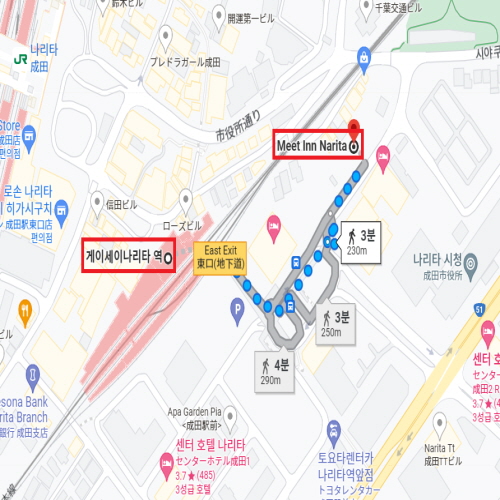 2019년 오픈한 미트 인 나리타 호텔은 총 156개의 객실을 보유하였고 전 객실 금연으로 쾌적하게 이용할 수 있다. 케이세이나리타 역(京成成田駅)에서 도보로 약 3분 거리이며 나리타 공항에서 호텔까지 무료 셔틀버스도 운행하고 있어 더욱 편리하게 이용할 수 있다. 또한 뷔페 스타일의 다양한 아침 식사를 맛볼 수 있으며 싱글룸, 더블룸, 트윈룸 등 다양한 객실 타입과 코인세탁실, 남성 전용 목욕탕 등 편리함을 갖춘 호텔이다. |