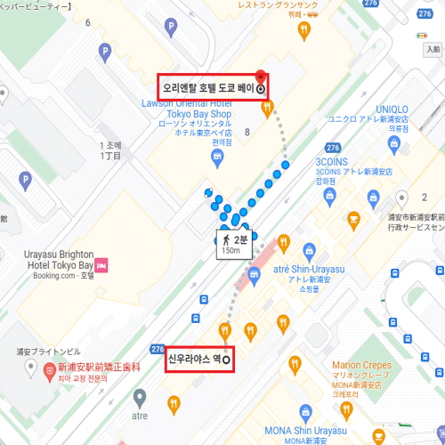 오리엔탈 호텔 도쿄 베이는 하네다 공항에서 차로 약 28분, 나리타 공항에서 차로 약 42분 거리에 위치하였으며 신우라야스 역(新浦安駅)과 직결되어 편리하게 이동할 수 있다. 또한 도쿄 역까지 JR케이요선(京葉線),JR무사시노선(武蔵野線)으로 약 17분, 도쿄 디즈니 리조트가 있는 JR 마이하마 역(JR舞浜駅)까지는 한 정거장 거리에 위치해 있으며 호텔에서 도쿄 디즈니 리조트까지 무료 셔틀버스로 이동이 가능하다. 그 밖에도 호텔 인근에는 쇼핑몰과 온천 시설 등 다양한 시설과 총 511개의 여러 타입의 객실, 수유실, 24시간 이용 가능한 편의점 등 편리하게 머물기 좋은 호텔이다. |