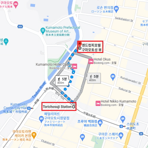 2019년 7월에 오픈한 앤드컴피 호텔은 총 98개의 객실을 갖춘 구마모토 성의 멋진 뷰를 자랑하는 호텔이다. 후쿠오카 공항에서 차로 약 1시간 19분, 토리초스지 역(通町筋駅)에서는 도보로 약 5분 거리에 위치하였으며 구마모토 중심부까지 도보권 내로 이동이 가능하여 비즈니스 및 관광의 거점으로 편리한 위치이다. 또한 이른 아침부터 이용할 수 있는 아침식사와 옥상 테라스에서는 구마모토 성의 멋진 경치를 즐기며 편안한 시간을 보낼 수 있다. |