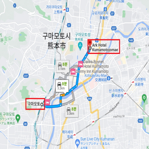 후쿠오카 공항에서 차로 약 1시간 30분, JR구마모토 역(熊本駅)에서는 차로 약 10분 거리에 위치해있으며 중심지에 근접해 있어 주변 관광지와의 접근성이 좋은 호텔이다. 10층에 위치한 레스토랑에서는 구마모토 향토요리는 물론 뷔페 스타일의 아침식사와 아름다운 구마모토 성의 파노라마를 한눈에 감상할 수 있다. 특히 갓 구운 바삭바삭한 크루아상은 꼭 드셔보시길 추천하고 있다. 그 밖에도 차분한 분위기의 총 222개의 객실과 싱글룸, 더블룸, 트윈룸 등 다양한 타입의 방을 선택할 수 있다. |