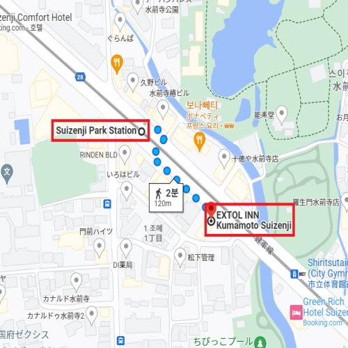 후쿠오카 공항에서 차로 약 1시간 26분, 스이젠지 역(水前寺公園駅)에서는 도보로 약 2분 거리에 위치하였으며 스이젠지 공원 바로 옆에 위치하여 가볍게 산책을 하기에도 좋다. 또한 구마모토의 중심지에 위치하여 비즈니스나 관광에 접근성이 매우 편리한 호텔이다. 총 108개의 객실은 전실 금연으로 더욱 쾌적하게 이용할 수 있으며 이른 아침 무료로 이용할 수 있는 조식 서비스는 갓 구운 빵과 신선한 샐러드, 된장국 등 좋아하는 요리를 자유롭게 즐길 수 있다. |