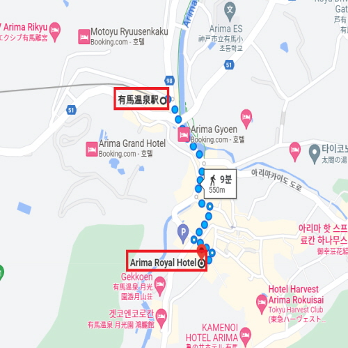 아리마 온천마을 중심에 위치하였으며 역에서도 가깝기 때문에 관광하기에도 편리하다. 총 41개의 객실은 노천탕이 포함된 객실 등 다양한 타입의 방이 준비되어 있다. 또한 아리마의 명탕 금천은 철분과 염분이 포함된 적갈색의 온천수로 냉증, 요통, 관절통 등에 효과가 있고 1층 대욕장, 노천온천뿐만 아니라 옥상에 위치한 전망 노천탕에서도 자연을 느끼며 편안한 시간을 보낼 수 있다. |