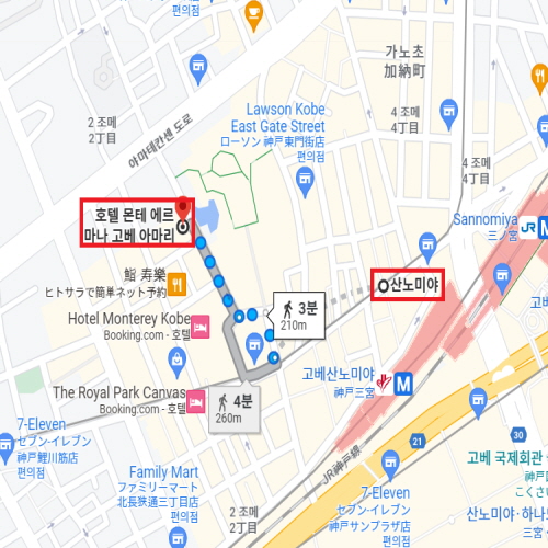 간사이 공항에서 차로 약 1시간 22분, 시영 지하철 산노미야역에서 도보로 약 3분 거리에 위치하였으며 고베 하버랜드, 난킨마치 등 관광지와의 접근성도 좋은 호텔이다. 총 180개의 객실과 여러 타입의 방이 마련되어 있으며 트윈룸 2개가 연결된 엑스트라 베드를 이용하여 최대 6명까지도 머물 수 있는도 커넥팅 룸도 완비되어 있다. 또한 건강한 계절 반찬, 빵과 과일, 디저트 등 다양하게 준비되어 있는 조식 뷔페도 즐길 수 있다. |