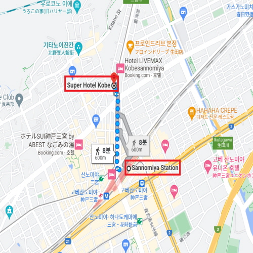 슈퍼 호텔 고베는 간사이 공항에서 차로 약 1시간 이내에 위치하였으며 JR산노미야역에서 도보로 8분, 신코베역과도 도보로 10분 거리로 비즈니스 및 관광의 거점으로 편리한 호텔이다. 총 87개의 객실과 다양한 타입의 방이 마련되어 있으며 이른 아침부터 제공되는 뷔페 형식의 건강한 조식 메뉴도 맛볼 수 있다. 그 밖에도 취향에 맞게 선택할 수 있는 베개 코너와 코인세탁실, 와인, 칵테일 등 30여 가지의 음료를 무제한으로 마실 수 있는 웰컴 바도 이용할 수 있다. |