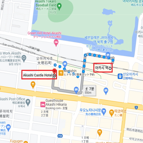 아카시 캐슬 호텔은 아카시역(明石駅)에서 도보로 약 7분 거리이며 오사카와 히메지의 중간점에 위치하여 각 방면으로 이동이 편리하다. 총 83개의 객실에는 비즈니스 출장 및 장기 체류에서 편하게 이용할 수 있는 싱글룸부터 가족이나 친구끼리도 함께 머물 수 있는 트리플룸까지 다양하게 마련되어 있다. 그 밖에도 웰컴 드링크 서비스와 샐러드와 수프, 여러 종류의 빵과 음료 등의 조식도 무료로 제공된다. |