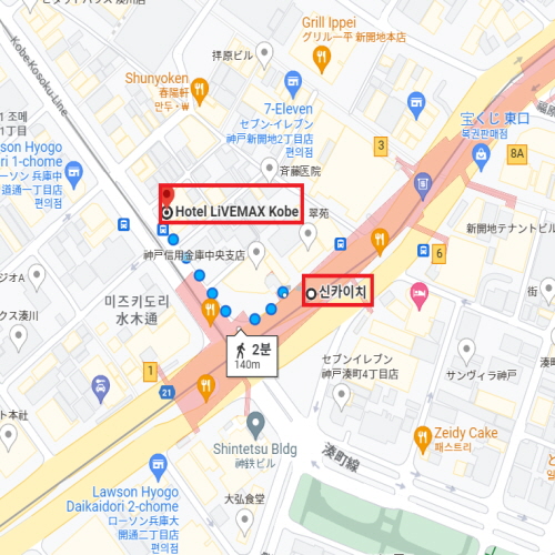 간사이 공항에서 차로 약 1시간, 신카이치역(新開地駅)에서 도보로 단 2분 거리에 위치하였으며 JR고베역, 하버랜드, 호빵맨 어린이 박물관 등 고베 인기 명소에 편리한 접근성을 지닌 호텔이다. |