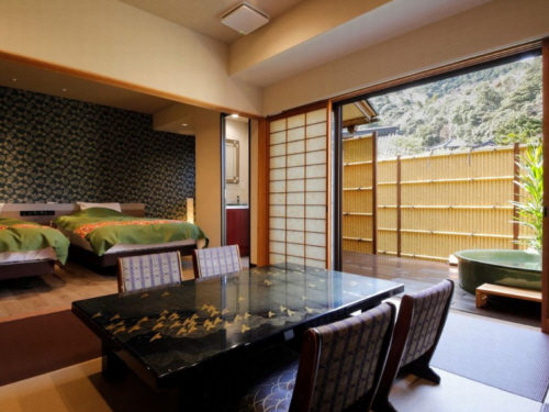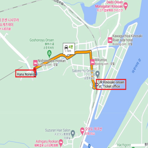 키노사키 온천마을은 자연 속에서 온천을 즐기며 여행의 피로를 풀 수 있어 오사카 근교의 관광 코스로 인기 있는 곳이다. 간사이 공항에서 차로 약 3시간 거리에 위치하였으며 키노사키온센역(城崎温泉駅)에서 료칸까지 송영도 가능하여 편리하게 이동할 수 있다. 또한 체크아웃 후에 오전 9시~10시 사이에도 역까지 가능하다. 총 13개의 객실이 완비되어 있으며 노천탕을 포함한 객실과 양실, 화양실 등 다양한 타입의 방이 마련되어 있는 레트로한 느낌이 인상적인 료칸이다. 그 밖에도 무료로 이용이 가능한 4개의 전세탕과 1인 전용 전세탕도 마련되어 있어 혼자서 느긋하게 온천을 즐길 수 있다. |