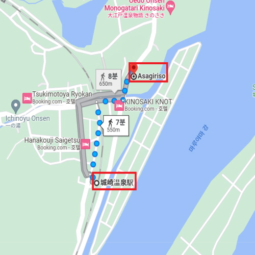 자연으로 둘러싸인 마루야마 강 근처에 위치한 아사기리소 료칸은 키노사키온센역(城崎温泉駅)에서 도보로 약 7분 거리에 위치하였으며 역에서 온천 조합 무료 셔틀버스로 이동이 가능하다. 총 35개의 넉넉한 방 수와 연인, 가족 단위부터 단체까지 이용할 수 있는 다양한 타입의 방이 마련되어 있다. 또한 객실에서는 마루야마 강이 흐르는 푸르른 자연과 료칸의 자랑인 정원을 볼 수 있으며 여름에는 눈앞에서 불꽃놀이를 감상할 수 있는 객실도 있다. 사계절 풍경과 겨울에는 설경도 즐길 수 있는 노천온천과 어린 자녀가 있는 고객이나 사정으로 인해 온천욕을 하지 못하는 손님들도 편안하게 이용할 수 있는 전세 욕실도 마련되어 있다. 그 밖에도 제철 식재료를 사용한 맛있는 요리도 인기 있는 료칸이다. |