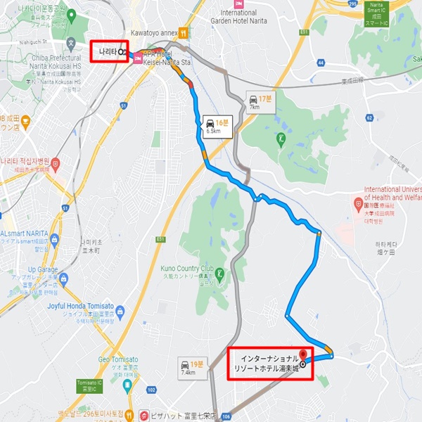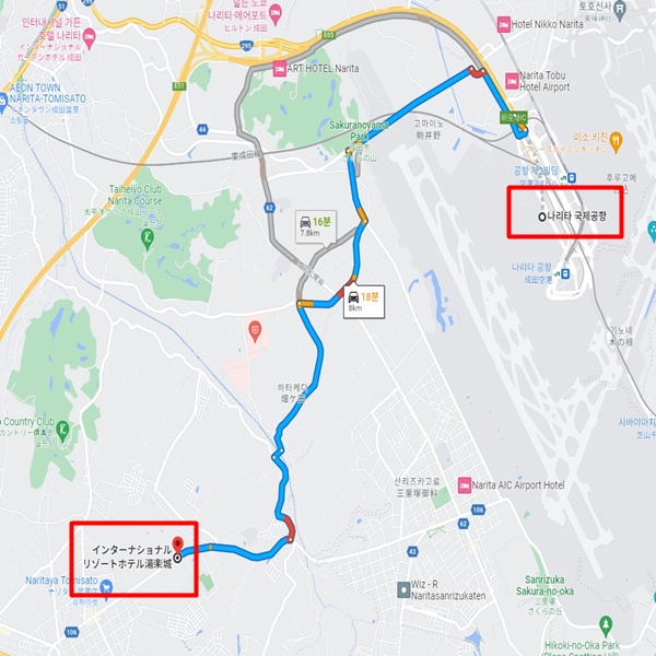 나리타 공항에서 차로 약 18분 소요  나리타 역에서 차로 약 16분 소요