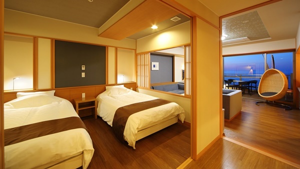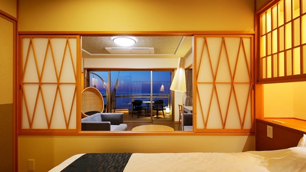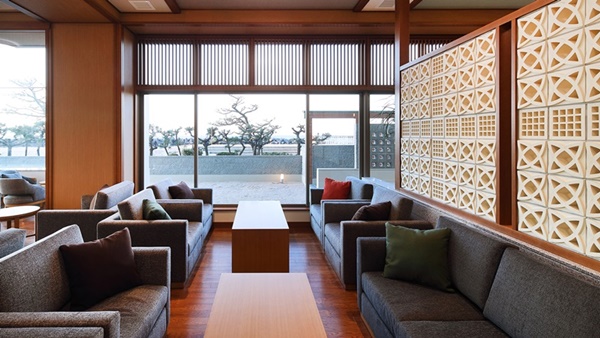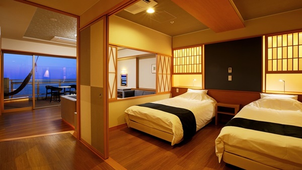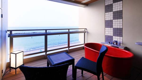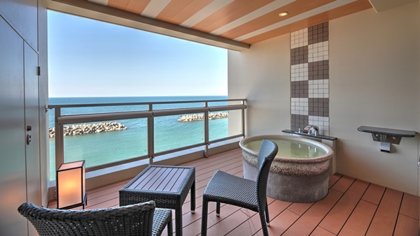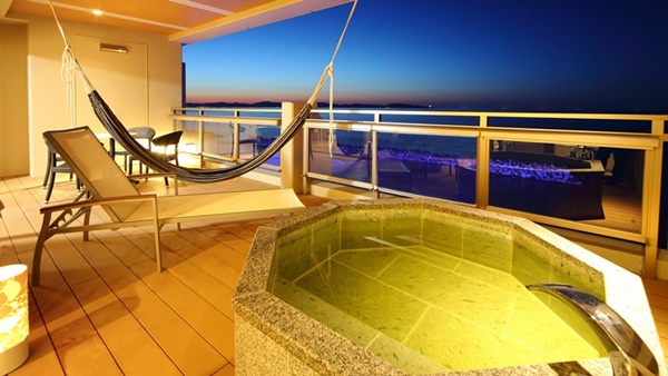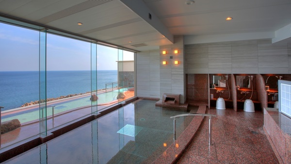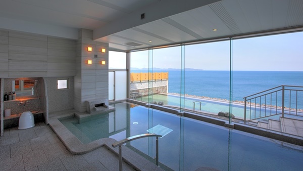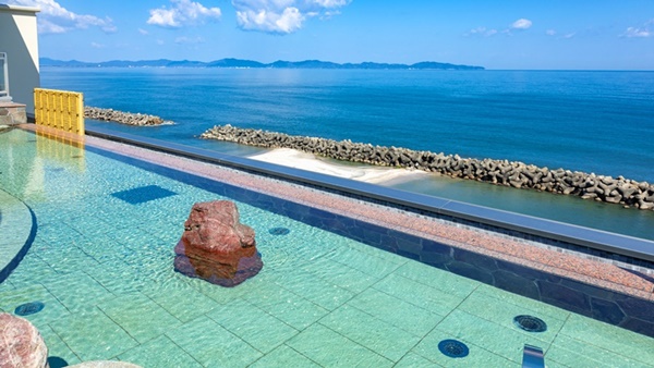 돗토리현 요나고시에 위치한 카이케 유우게츠 료칸은 32개의 객실 전부가 오션뷰에 노천온천이 포함된 고급료칸이다. 료칸의 7층에는 바다를 전망할 수 있는 큰 노천온천으로 인피니티 천공 노천온천이 준비되어 있다. |