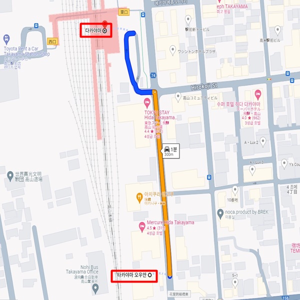 히다하나사토노유 타카야마오우안은 타카야마역(JR高山駅)에서 도보 5분이면 이동 가능한 위치에 있어 관광에 최적인 로케이션이다. |