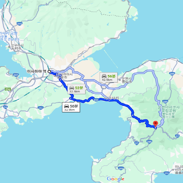 이사하야 역에서 차로 약 50분 소요
