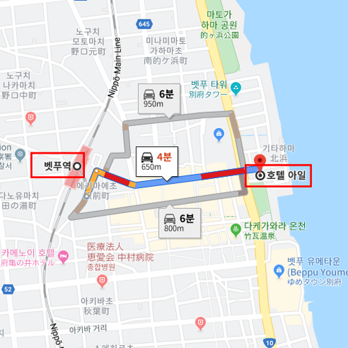 숙박지 주변벳부역에서 차로 약 4분 소요 |