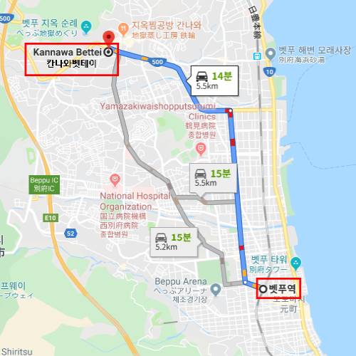 숙박지 주변벳부역에서 차로 약 14분 소요 |