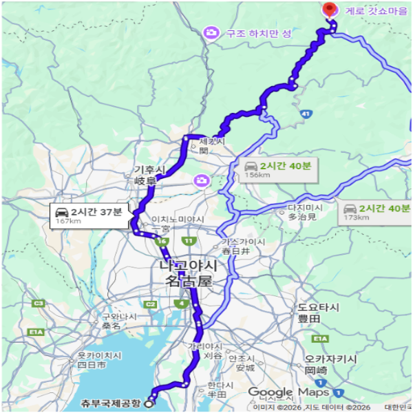 공항 기준나고야중부국제공항에서 차로 약 2시간 40분 소요 |