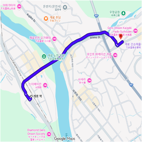 | 시설 주변 정보 | ★ 로손 편의점 게로 온천점(ローソン 下呂温泉店) : 도보 약 8분 소요 - 영업시간: 24시간 - 전화번호: 0576-25-3955 ★ 게로 온천 합장(下呂温泉合掌村) : 도보 약 8분 소요 게로 온천 합장촌은 국가지정 중요유형민속문화재 ‘구 오오도가 주택’을 비롯해 시라카와고 마을 등에서 이축한 10동의 합장양식 민가로 집락을 재현한 예전 생활을 아는 중요한 야외 박물관입니다. - 영업시간: 연중무휴 (08:30~17:00) - 전화번호: 0576-25-2239 |